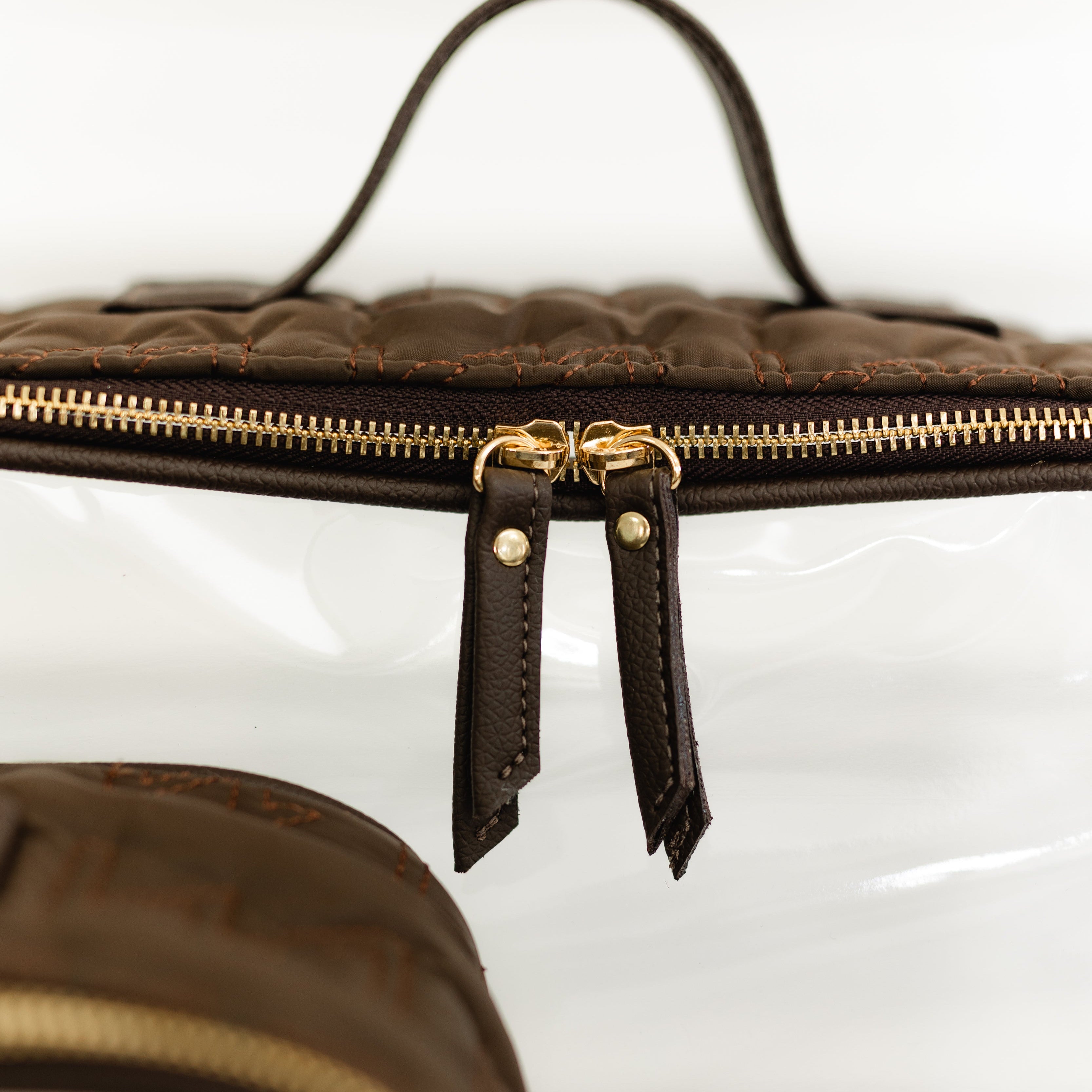 Com 4 nécessaires (PP, P, M e G), o kit traz elegância e praticidade para o dia a dia da maternidade. O tecido em nylon leve e impermeável facilita a limpeza, enquanto o plástico cristal transparente permite visualizar rapidamente o conteúdo. Pode ser bordado com as iniciais do bebê.
