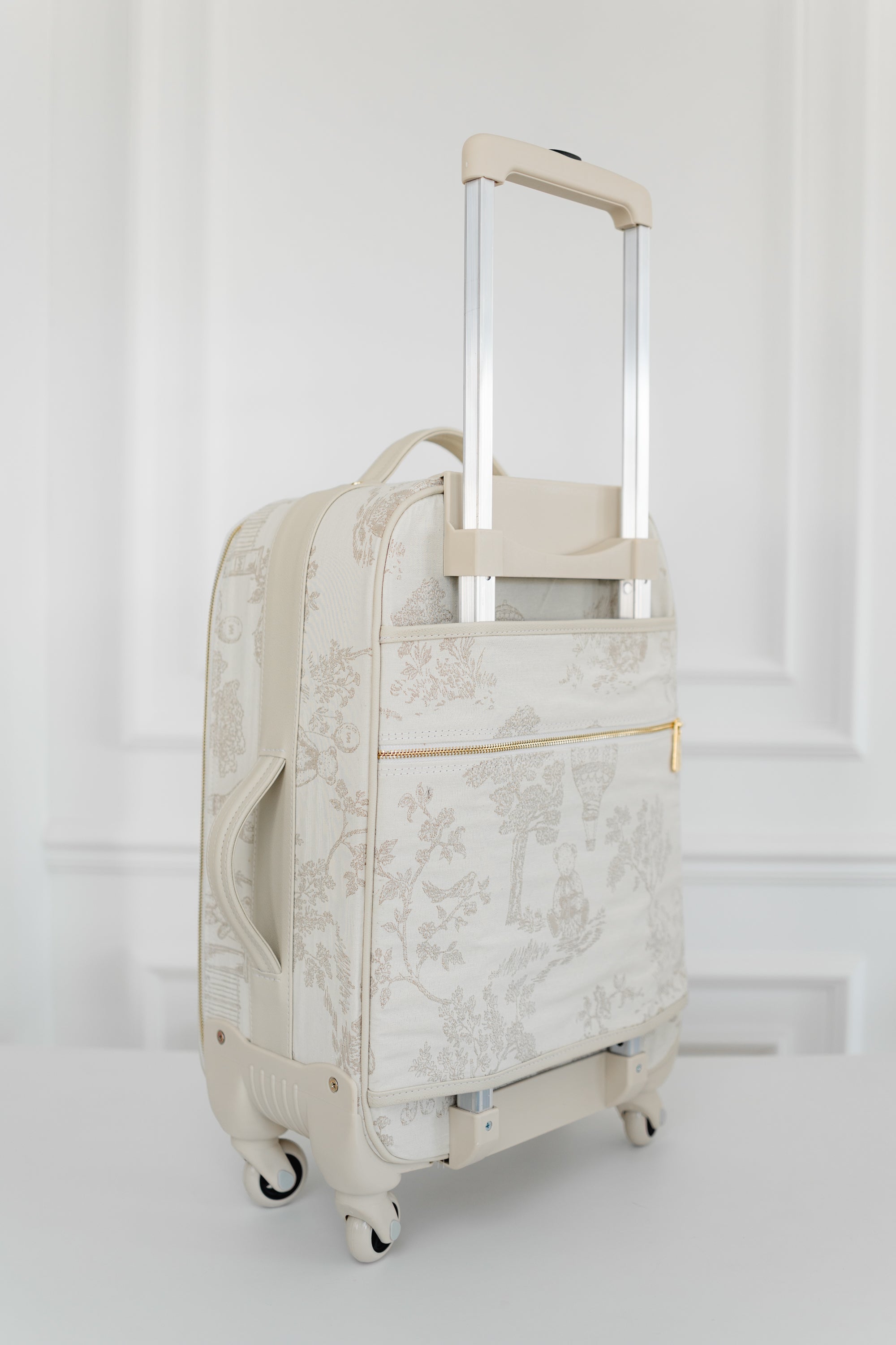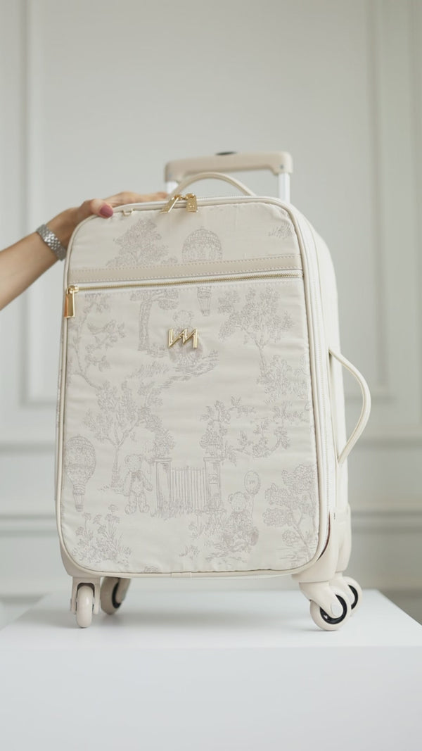Ligereza para acompañar cada etapa de la maternidad: la maleta con ruedas de la colección Le Petit ofrece gran volumen, acabado en jacquard Toile de Jouy y ruedas suaves (360°) para desplazamientos cómodos. El asa de arrastre se integra discretamente en el elegante diseño, mientras que el forro interior reforzado y los bolsillos organizadores garantizan practicidad en viajes y paseos.